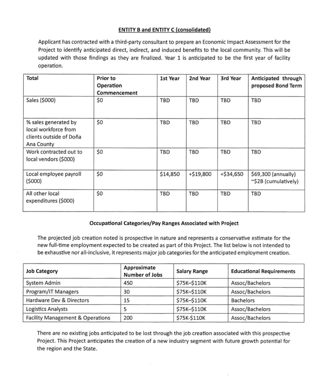 On the expense side, they estimate spending $125 million annually with local contractors by year three — though how many of those contractors will be from New Mexico, as opposed to El Paso, Texas or even Ciudad Juárez, Mexico isn’t stated.