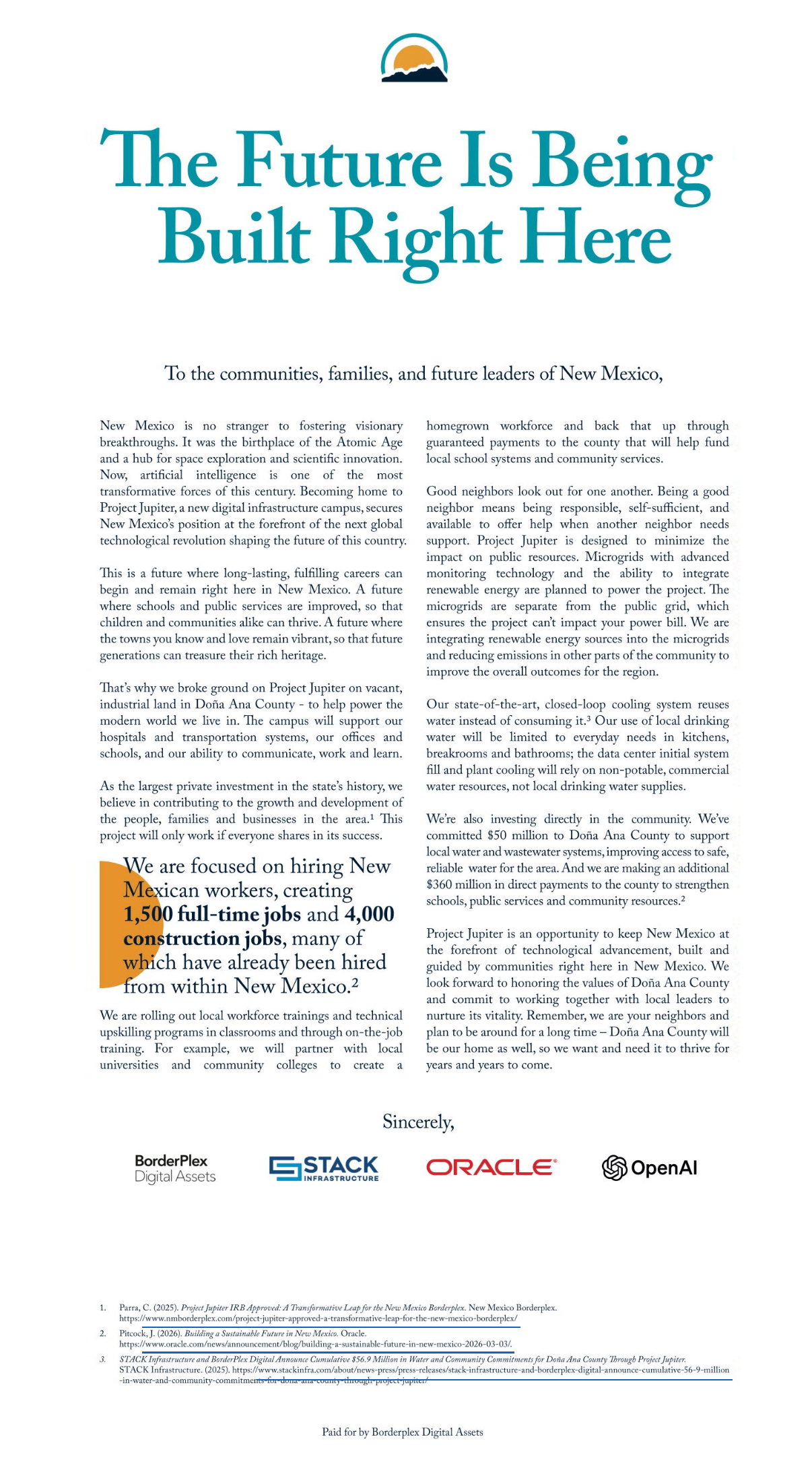 The developers — BorderPlex Digital, Stack Infrastructure, Oracle and OpenAI — recently placed a full-page ad in the Albuquerque Journal proclaiming that they would be “good neighbors.”